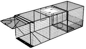153 Large Raccoon Trap Size: 42" x 14" x 14", 1/4" partial steel rod frame, covered with 14 gauge 1" x 1" galvanized welded wire. Kage-All live animal traps are made of zinc treated and beige coated steel heavy gauge contruction. The Kage-All is built to last for years of use. Durable and safe, its the humane way to trap live animals. Easy to set, simply lift ring on bayonet latch and open door. Move set rod forward so that it supports the door cross member and holds the door open. Easy to release, place trap door facing away from you. Lift ring on bayonet latch or to be safe tie a string on the ring and slowly open the trap door. Controls: Large raccoons, armadillos, oppossums, badgers, bobcats, foxes, ground hogs and porcupines.